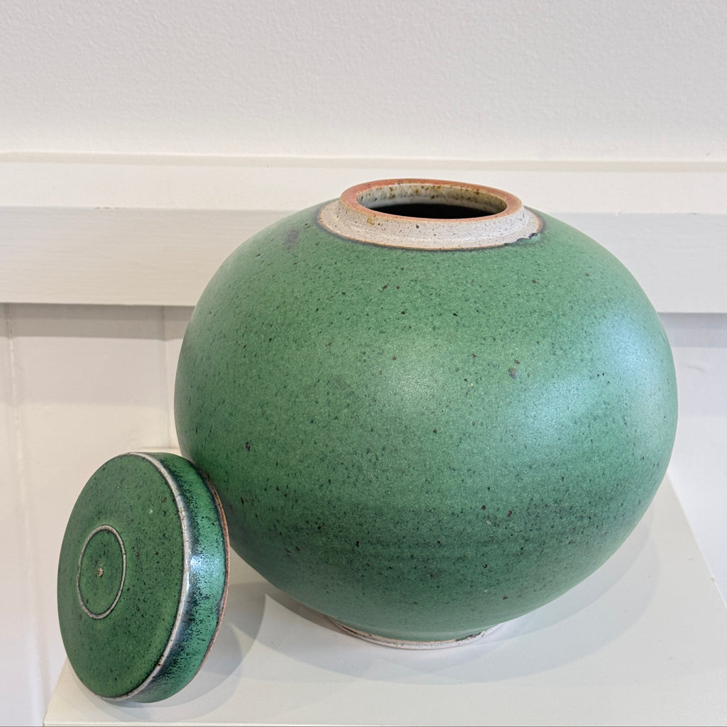 Greg Crowe -Green Lidded Sphere, 2025. Stoneware Clay, Gas Fired Reduction (gcr331)